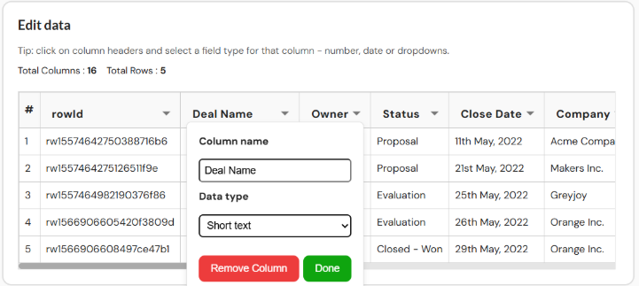 Click on column headers to define their field types (e.g., Text, Number, Date, Dropdown)