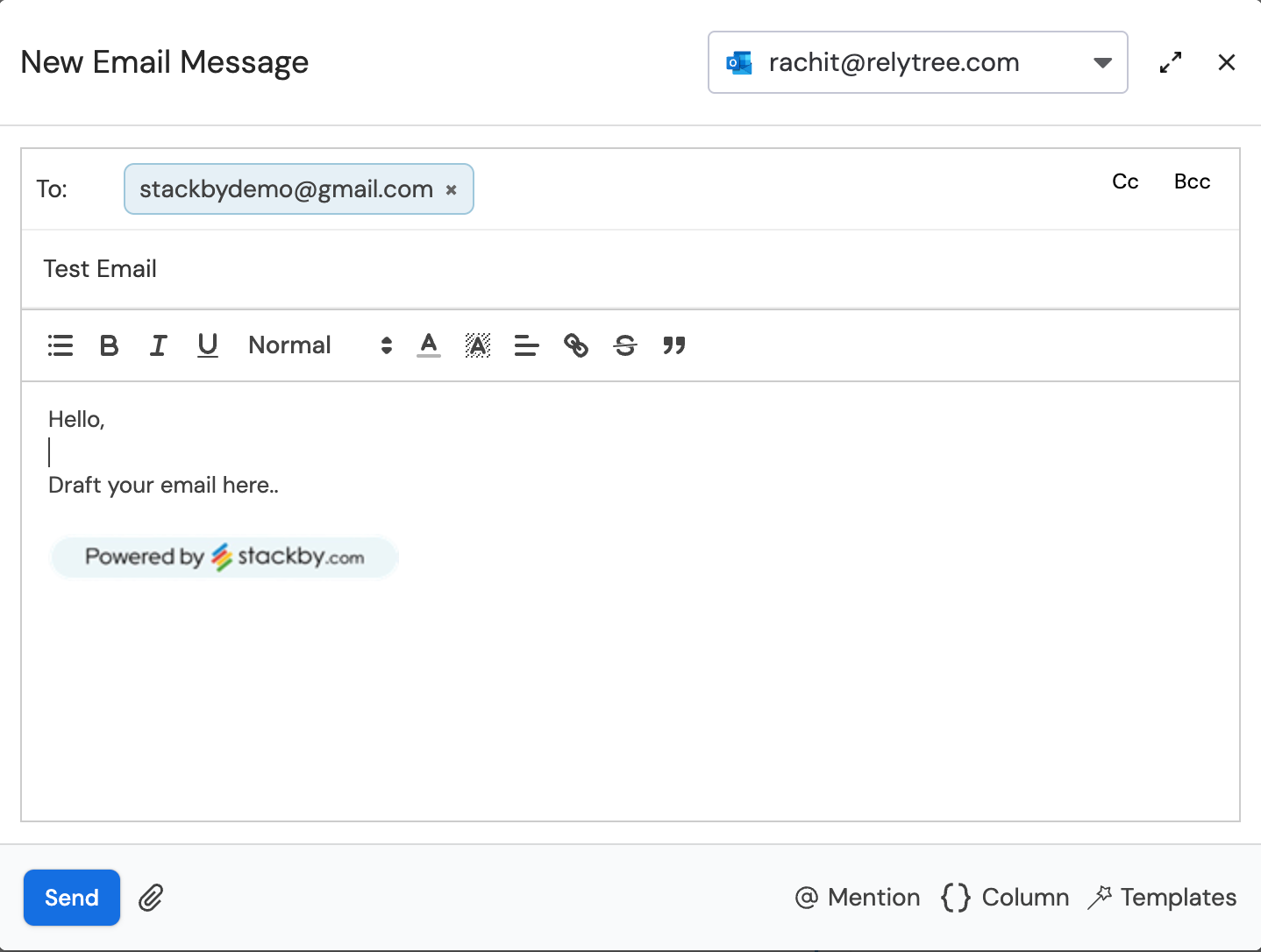 You can place dynamic column variables or mention anyone on the subject and body part of the email model. Once the email is drafted, you can click on ‘Send’.