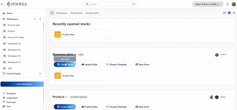 Creating a new stack will create new empty stack with a few empty records (rows) labelled ‘Table 1’ and with some default column types.